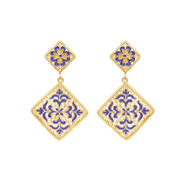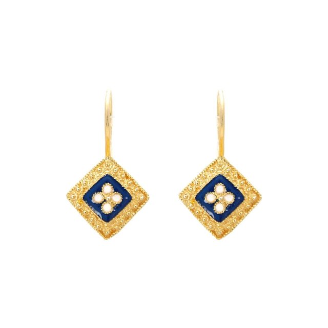 E76 藍併金菱形花花圖案耳環 (貨期預5月中)